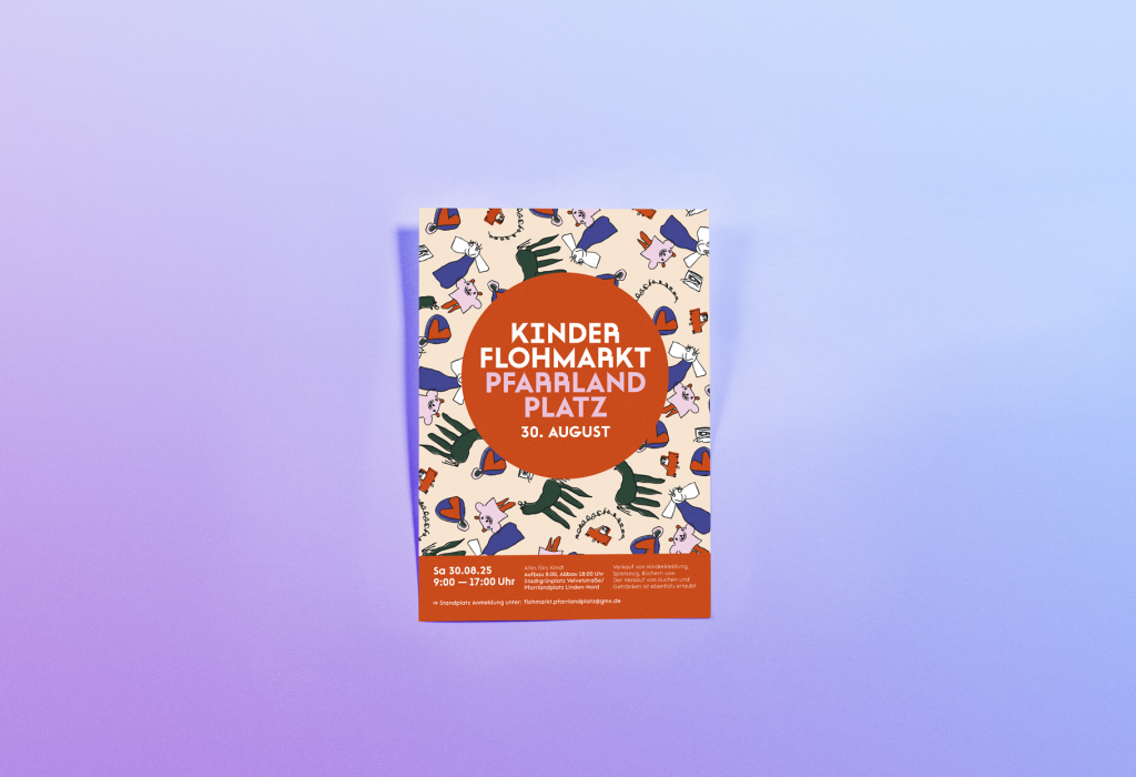 Postergestaltung für den ersten Kinder Flohmarkt am Pfarrlandplatz in Hannover Linden. Die Basis ist eine Kinderzeichnung meiner Tochter.